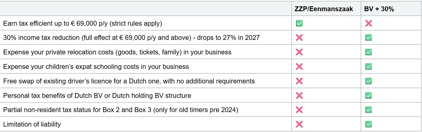 When deciding between either the ZZP/Eenmanszaak or the BV + 30% ruling setup, there are a lot more factors to consider than the mere tax treatment of both. You are well advised to make a calculated decision, as a transfer to a BV + 30% ruling later is not possible if at first you have chosen the ZZP/Eenmanszaak. It is however possible to transfer to a normal BV setup, but you will not be able to obtain the 30% ruling going forward.