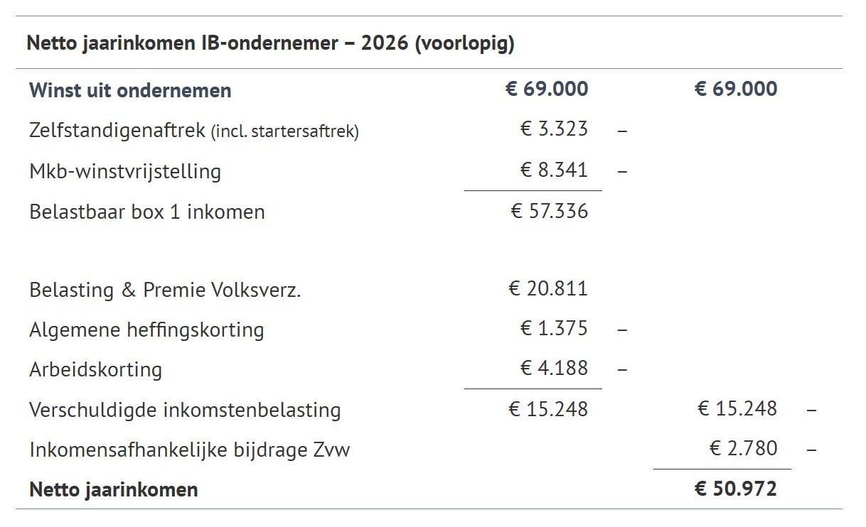 € 69,000 profits per year in a ZZP/Eenmanszaak yields € 50,972 post tax salary. Source: Standard ZZP salary calculator on internet.