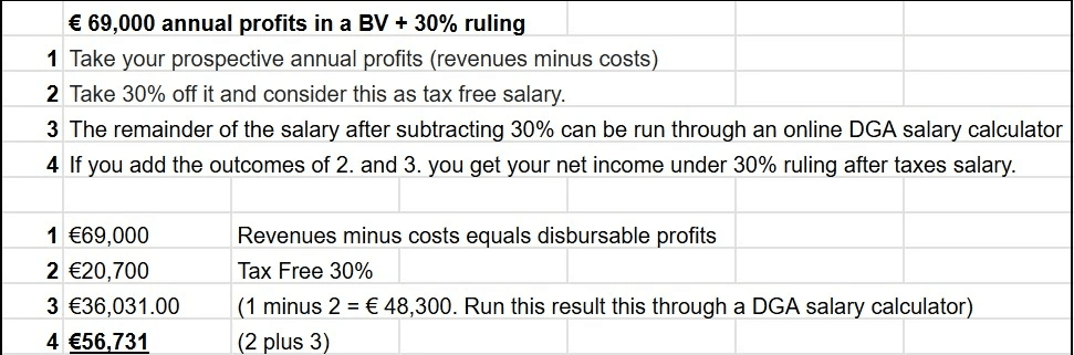 If you don’t meet these criteria, you cannot apply the tax breaks and the ZZP/eenmanszaak tax treatment will become the same as that of regular employment, which is even less attractive than a BV without 30% ruling. If you meet the above criteria, you can take the following rule of thumb: if you earn € 69,000 per year in your company, the BV + 30% is more tax efficient than ZZP/eenmanszaak. If you go below € 69,000, the 30% ruling does not have full effect so its advantages quickly diminish and the ZZP/Eenmanszaak becomes more tax efficient at around the € 65,000 mark. See the calculations above and below for rough indications of post tax salary take-aways.